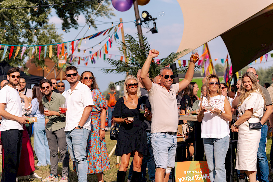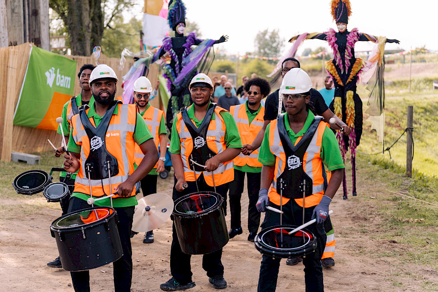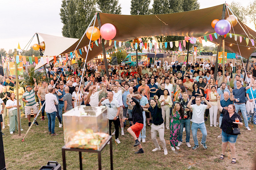 Zodra de eerste gasten arriveerden, was de toon gezet. De geur van foodtrucks vulde de lucht, de beats van de brass band en kleurrijke steltenlopers verwelkomden iedereen met een glimlach.
